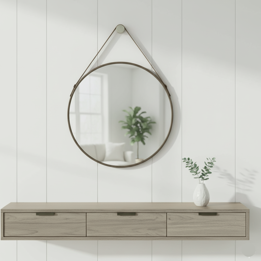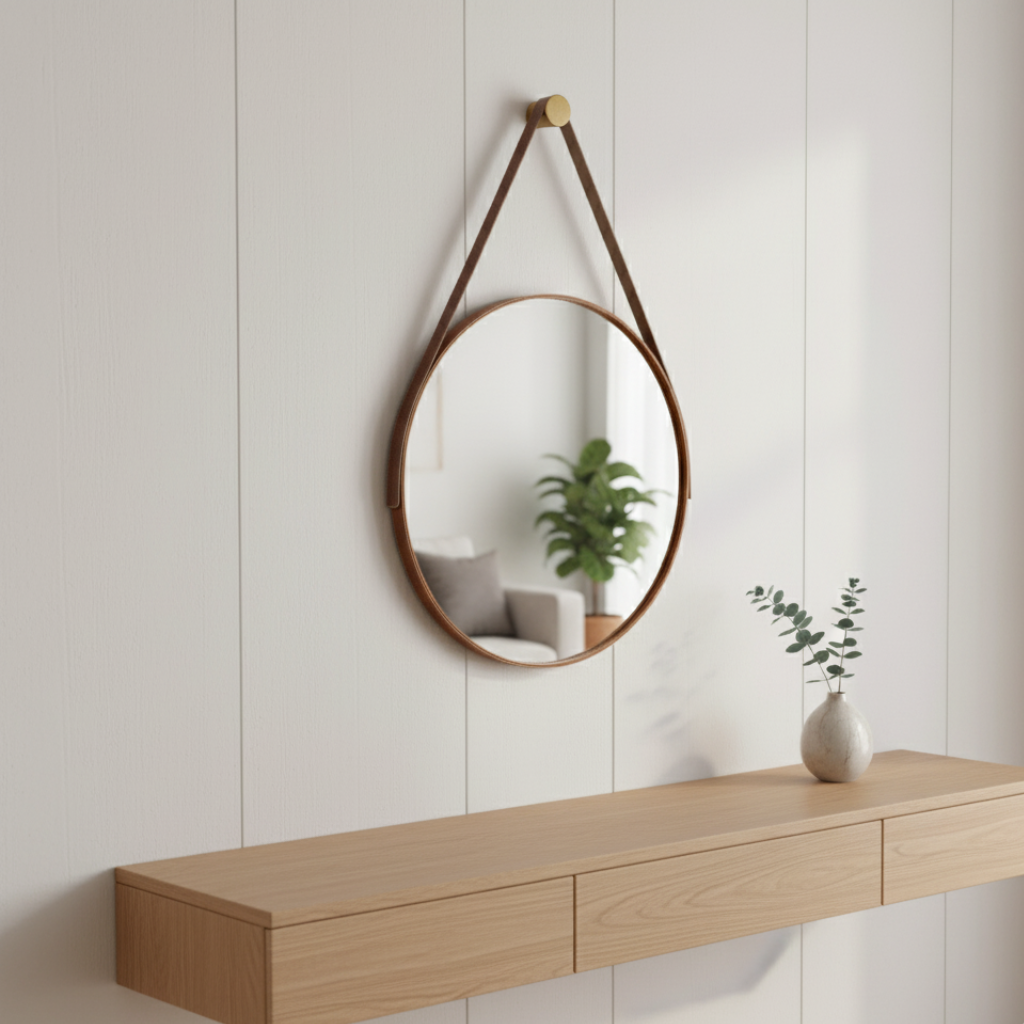 Se você ama uma casa bonita, moderna e com aquele toque de personalidade que impressiona, o Espelho Adnet Couro Costurado com Alça é a peça perfeita para você!